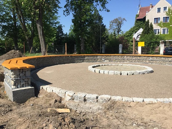 Siedziska wykonane zostały z wykorzystaniem koszy gabionowych. Teren wokół paleniska wykonany został z nawierzchni mineralno-żywicznej. Same palenisko wypełnione jest kostką kamienną.