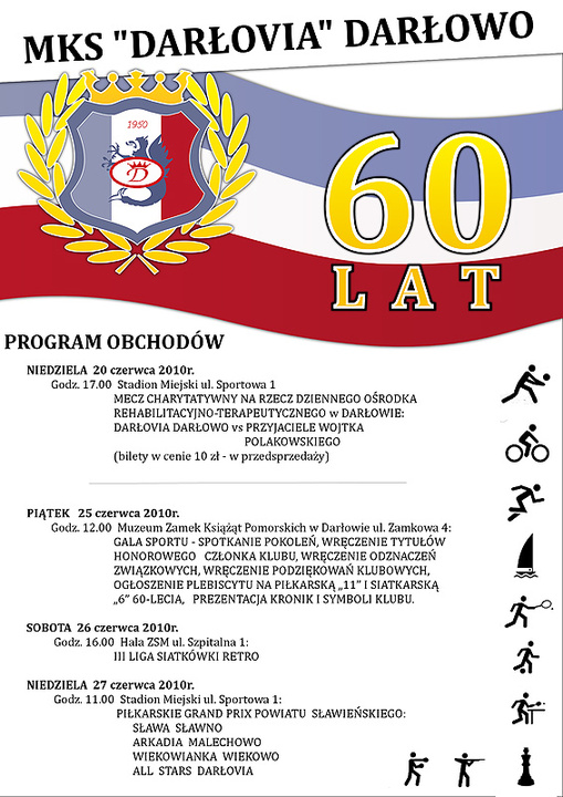 W ramach obchodów 60-lecia Miejskiego Klubu Sportowego „DARŁOVIA" Darłowo w dniu 20 czerwca 2010 r. o godz. 17.00 rozegrany zostanie w Darłowie mecz charytatywny na rzecz Dziennego Ośrodka Rehabilitacyjno - Terapeutycznego, pomiędzy Darłovią, a gwiazdami polskiej piłki „Przyjaciele Wojtka Polakowskiego". Ponadto w programie obchodów jubileuszu: