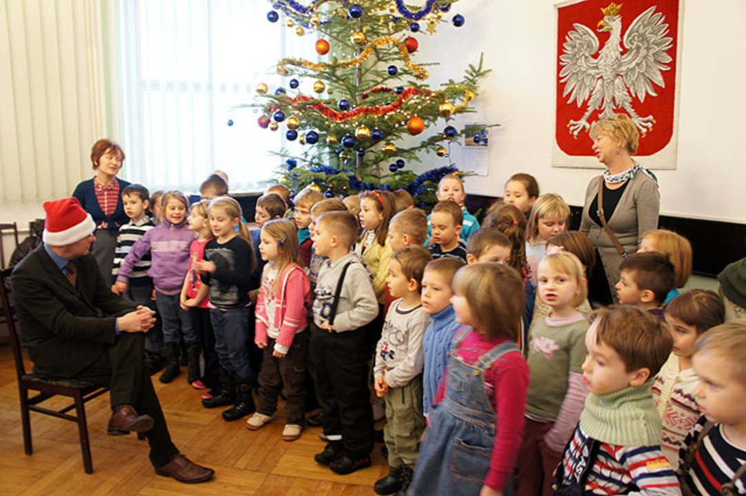 Przedszkolaki z Przedszkola nr 2 im. Janiny Porazińskiej w Darłowie w liczbie 35 odwiedziły w poniedziałek 20 grudnia darłowski ratusz, gdzie spotkały się z burmistrzem miasta -Arkadiuszem Klimowiczem. Sympatyczne i rozgadane maluchy poznały najważniejszą osobę w Darłowie, a przy okazji zobaczyły jak wygląda sala obrad Rady Miejskiej. Pod choinką dzieciaki śpiewały kolędy i składały życzenia gospodarzowi miasta. Podczas sympatycznej rozmowy Arkadiusz Klimowicz podarował dzieciom słodkie upominki i zrobił sobie zdjęcie pod ratuszową choinką.