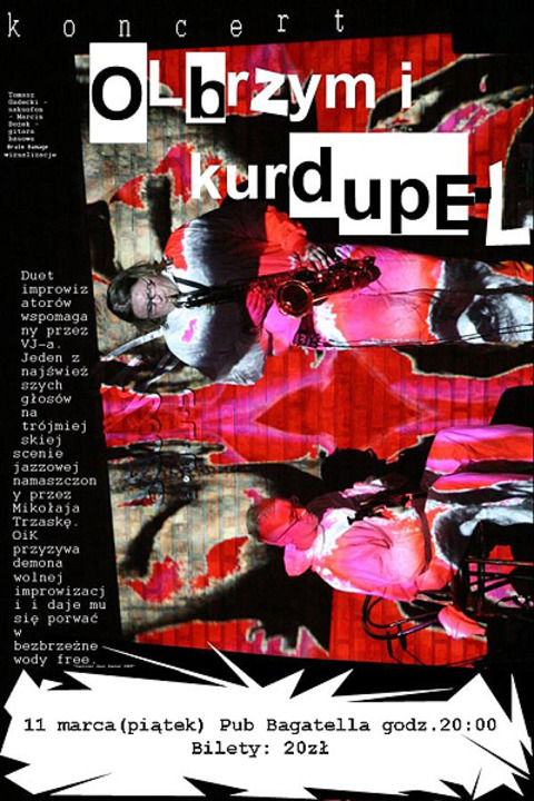 Olbrzym i Kurdupel to duet muzyków + VJ tworzący na żywo improwizowane wizualizacje wyświetlane na muzyków. Do Pubu Bagatella zawitają po raz drugi, by zaprezentować swój spektakl dźwięku i obrazu od początku do końca improwizowany. Całość wchodzi w osobliwą symbiozę, w której widz/słuchacz gubi granicę między fonią i wizją.