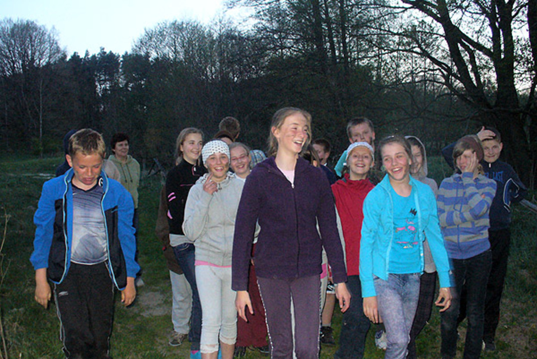 Po kolacji, podzieleni na dwie grupy , udaliśmy się na nocne podchody. Na tropiących czekały ciekawe, aczkolwiek dość niezwykłe zadania, które należało wykonać, np. maseczka błotna czy przejście w parze, mając związane sznurówkami. To dopiero był nie lada wyczyn. Późnym wieczorem pod wiatą rozpalono ognisko. Przy akompaniamencie bębna oraz piosenkach śpiewanych przez dzieci można było upiec przepyszne kiełbaski.