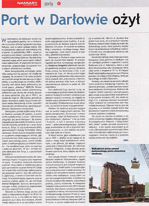 Mimo zaangażowania samorządu, przez kilka następnych lat portowi nie wiodło się najlepiej. Na szczęście 5 lat temu na Darłowo zwróciła uwagę Morska Agencja w Gdyni (MAG), w wyniku czego we wrześniu 2009 r. otwarty tam został uniwersalny terminal (patrz: „Namiary" 2009/19). Proces degrengolady portu został zahamowany, jakkolwiek jego obroty nie wróciły jeszcze do stanu sprzed lat, gdy, jak w 1993 r., zawinęło do niego ok. 100 statków, głównie po zboże i drewniane zrębki. Stacjonowało tam także kiedyś kilkadziesiąt kutrów rybackich (obecnie jest ich kilkanaście, uprawiających głównie rybołówstwo turystyczne).