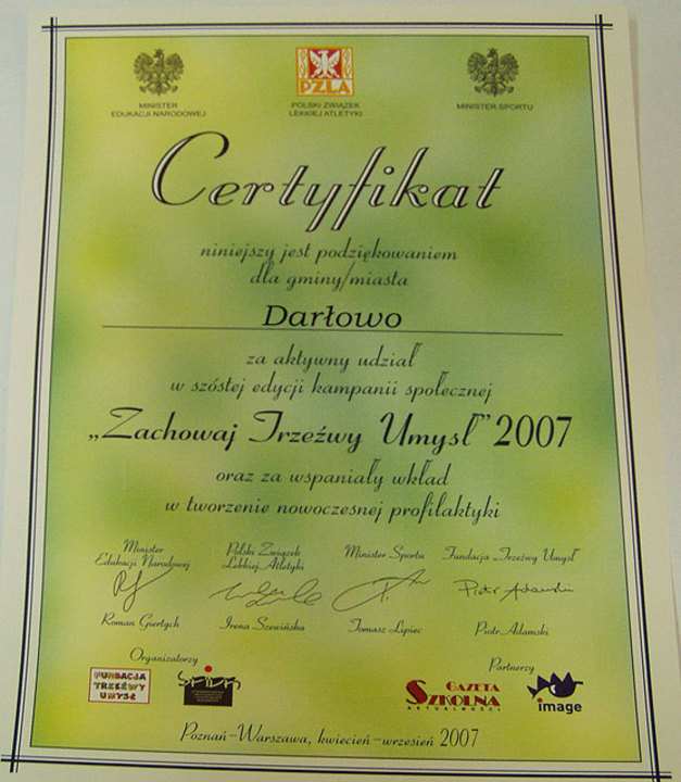Doceniając zaangażowanie w tegoroczną kampanię „Zachowaj Trzeźwy Umysł” miasto Darłowo otrzymało Certyfikat i podziękowanie za aktywny udział w szóstej edycji tej społecznej kampanii oraz za wspaniały wkład w tworzenie nowoczesnej profilaktyki. Dyplom podpisali m.in. : minister edukacji narodowej, minister sportu, prezes PZLA Irena Szewińska. Również kilkoro dzieci otrzymało od organizatorów dyplomy i specjalne nagrody za bezpośredni wkład w tę akcję. Otrzymali je: