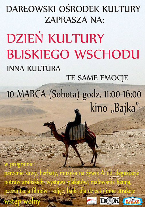 Darłowski Ośrodek Kultury zaprasza na Dzień Kultury Bliskiego Wschodu - inna kultura te same emocje, który odbędzie się 10 marca 2012 (sobota) w Kinie Bajka. Impreza odbędzie się w godzinach 11:00 - 16:00 a wstęp na nią jest bezpłatny. W programie m.in.: