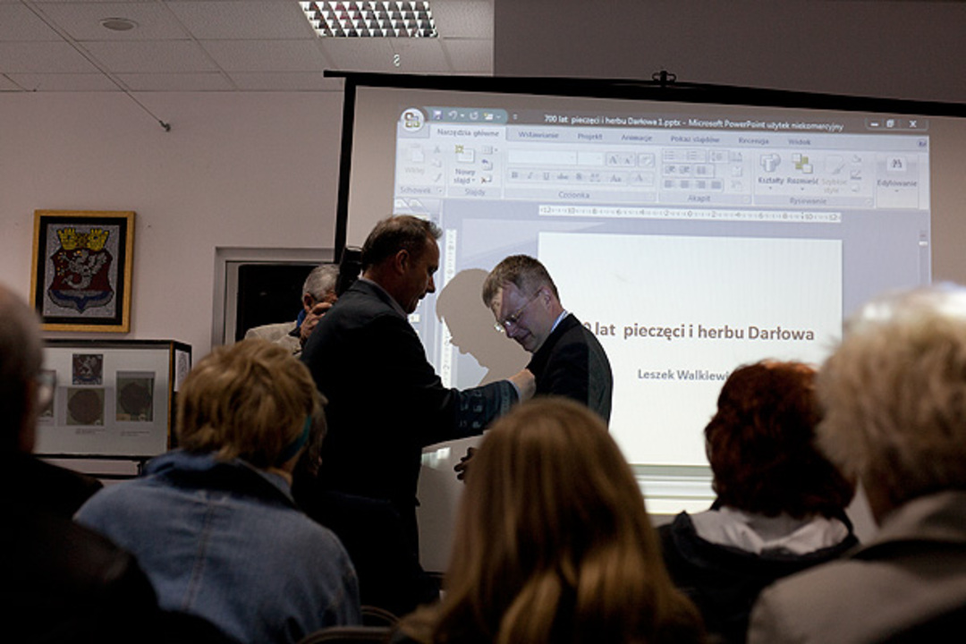 Z okazji siedemsetlecia drugiej lokacji miasta Darłowo w Terminalu Sztuki 17 maja Darłowski Ośrodek Kultury i Towarzystwo Przyjaciół Ziemi Darłowskiej otworzyły wystawę Leszka Walkiewicza p.t. „Siedem wieków herbu i pieczęci Darłowa”. Zorganizowaniu wystawy przyświecały dwa cele. Pierwszym była ekspozycja pieczęci i herbu miasta Darłowo w ujęciu historycznym. Drugim jest prezentacja różnych wariantów oraz stylizacji herbu i pieczęci umieszczonych na rozmaitych przedmiotach, jaki np. na Sztandarach, folderach, medalach, dokumentach, książkach, budynkach, budowlach pomnikach, tablicach pamiątkowych, monetach i zastępczych pieniądzach papierowych, kubkach, serwetkach, planach miasta, kutrach i statkach, taksówkach, a nawet na otwieraczu do butelek, czy nożyku do rozcinania papieru. Autor wystawy na wstępie zaprezentował na ekranie genezę powstania pieczęci i herbu Darłowa pochodzących od pieczęci braci Święców Jaśka, Piotra i Wawrzyńca oraz przestawił pochodzące z archiwalnych zbiorów historyczne odmiany pieczęci i herbów. Goście odwiedzający wystawę otrzymali 52 stronicową broszurę p.t. „Siedem wieków herbu Darłowa”. Ozdobą wystawy są m.in.: mozaikowy herb Darłowa wykonany przez Annę Skrzynkowską i herb dla statku Franek Zubrzycki” wykonany przez Jerzego Świątka. Na wystawie pokazano też najlepsze prace, które wygrały Konkurs Plastyczny na Herb Darłowa. W kategorii powyżej lat 13 jury konkursu przyznało dwie nagrody główne dla: Dominiki Schań lat 13 oraz Moniki Rettmańskiej lat 13 ze SP 3. Miejsce II przyznano: Nikoli Olchawik lat 13 (wszyscy ze SP 3 w Darłowie). W kategorii od lat 9 do 13 przyznano również dwie nagrody główne dla: Filipa Kaczyńskiego lat 9 oraz Julii Brygały lat 12 oboje ze SP nr 3 w Darłowie. Miejsce II zajął herb Krystiana Zdyra lat 12 z SP 3 w Darłowie, a trzecie Patrycji Ferka lat 10 z Zespołu Szkół w Darłówku. W kategorii do lat 9 dwie nagrody główne przypadły dla: Karoliny Ziemskiej lat 8 oraz Klaudii Żółć lat 9 obie z Zespołu Szkół w Darłówku. Miejsce II zajęła praca Nadii Leppert z SP 3 w Darłowie, a miejsce III herb Łukasza Piłata lat 7. Nagrodę specjalną dyrektora Darłowskiego Ośrodka Kultury za pracę zbiorową jury przyznało: Julii Pepińskiej lat 10; Mizumi Feicht lat 11 i Kindze Książkiewicz lat 9.L. Walkiewicz