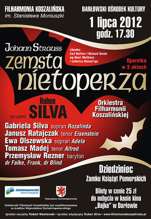 Już w niedzielę 1 lipca melomanów i miłośników operetki zapraszamy na darłowski zamek. Muzyczne arcydzieło Johanna Straussa "Zemsta nietoperza" usłyszymy na scenie plenerowej dziedzińca zamkowego w wykonaniu orkiestry Filharmonii Koszalińskiej. Zaśpiewają m.in. Gabriela Silva ( sopran ) i Janusz Ratajczak ( tenor). To będzie muzyczne wydarzenie na początek wakacji! Bilety w cenie 25 zł. można kupić w kasie kina bądź też przed samym spektaklem na zamku. Początek operetki - godzina 17.30
