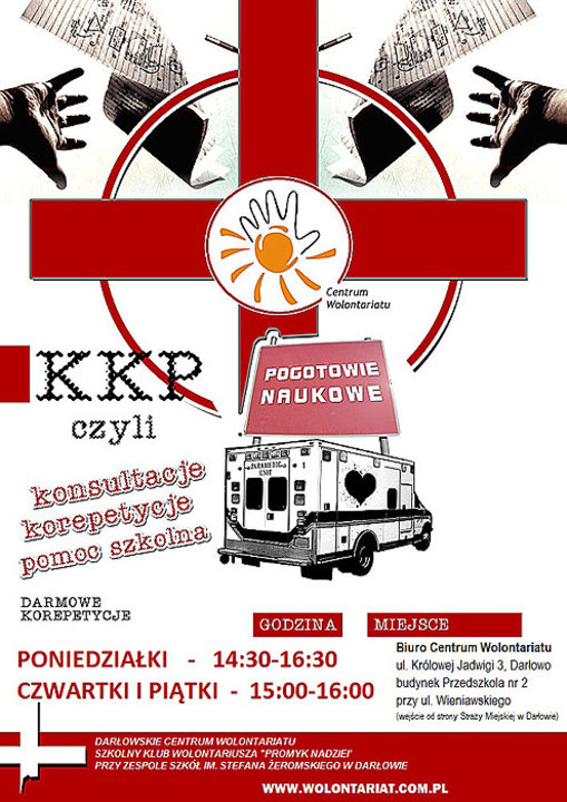 W roku szkolnym 2012/2013 podobnie jak w roku ubiegłym, wolontariusze ze Szkolnego Klubu Wolontariusza działającego przy Zespole Szkół im. Stefana Żeromskiego w Darłowie pomagać będą w nauce dzieciom i młodzieży z Darłowa i okolic. Trzy razy w tygodniu w poniedziałki w godzinach 14:30 - 16:30 oraz w czwartki i piątki w godz. 15:00 - 16:00 w siedzibie Darłowskiego Centrum Wolontariatu będą się odbywać bezpłatne konsultacje, korepetycje i pomoc w odrabianiu lekcji.