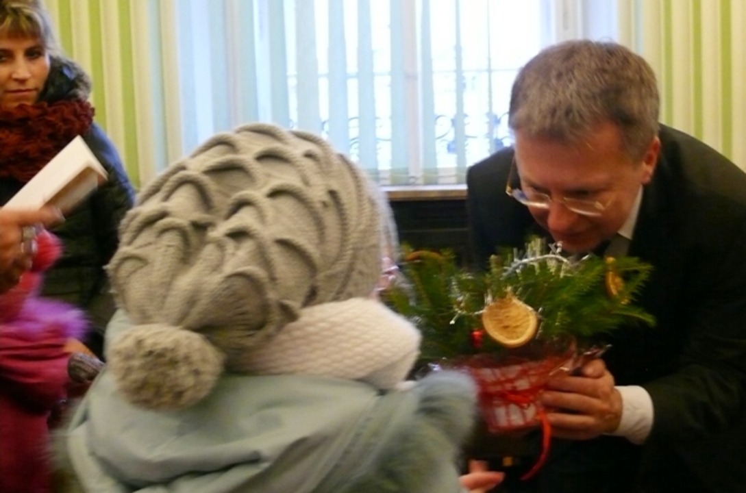 Gwar dziecięcych głosów i tupot małych nóżek – takie dźwięki wypełniły w dniu dzisiejszym Urząd Miejski w Darłowie. W sali konferencyjnej darłowskiego ratusza grupa integracyjna z samorządowego Przedszkola nr 2 im. Janiny Porazińskiej złożyła włodarzowi miasta życzenia od dzieci i pracowników Przedszkola. Życzono spełnienia marzeń i realizacji zamierzeń dla dobra mieszkańców miasta. Dzieciaki wręczyły burmistrzowi własnoręcznie wykonany stroik. Pod choinką częstowano maluchy i wychowawczynie słodyczami. Druga grupa przybyła z Niepublicznego Przedszkola „Jacek I Agatka”. Dzieciaki poprzebierane w aniołki, gwiazdorów, pasterzy, Trzech Króli, a nawet za diabełka śpiewały kolędy, recytowały wiersze i życzenia, a gwiazda kręciła młynka niczym wiatrak. Dzieciaki złożyły własnoręcznie wykonane kartki świąteczne i stroiki. Na koniec wizyty wszyscy zrobili sobie pamiątkowe zdjęcie pod rozświetloną choinką. Burmistrz w odpowiedzi niczym Św. Mikołaj obdarował maluchy słodkimi ciastkami i cukierkami.