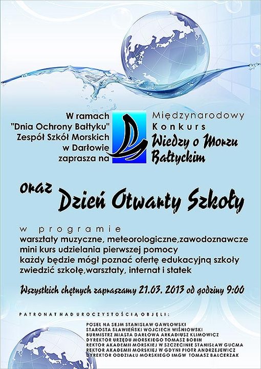 Dzień jest okazją, aby przypomnieć mieszkańcom Ziemi, że można zapobiegać problemom związanym z niedostatkiem wody oraz jej zanieczyszczeniem. I właśnie taki cel przyświeca organizatorom obchodów tego dnia w Zespole Szkół Morskich w Darłowie. Z tej okazji w szkole już 21 marca organizowany jest „Międzynarodowy Konkurs Wiedzy o Morzu Bałtyckim", nad którym honorowy patronat sprawują Poseł na Sejm Stanisław Gawłowski, Starosta Sławieński Wojciech Wiśniowski, Burmistrz Miasta Darłowa Arkadiusz Klimowicz, Dyrektor Urzędu Morskiego w Słupsku Tomasz Bobin, Dyrektor Oddziału Morskiego Instytutu Meteorologii i Gospodarki Wodnej w Gdyni Tomasz Balcerzak, Rektor Akademii Morskiej w Szczecinie Stanisław Gucma oraz Rektor Akademii Morskiej w Gdyni Piotr Jędrzejowicz.