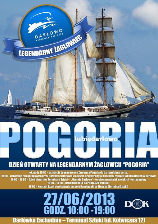 Jak nas poinformował kpt. Maciej Leśny (Wiceprezes PZŻ) w najbliższy czwartek - 27 czerwca br. do darłowskiego portu wpłynie legendarny żaglowiec POGORIA. Został on wybudowany w 1980 roku przez Stocznię Gdańską. Mierzy 47 metrów długości i 8 metrów szerokości. Jednostka o zanurzeniu 3,8 m po wejściu do darłowskiego portu zostanie zacumowana przy Terminalu Sztuki w Darłówku Zachodnim (ul. Kotwiczna 12). Jej przybycie planowane jest na godzinę 10:00. Po przywitaniu załogi Pogorii zostanie ona udostępniona zwiedzającym.