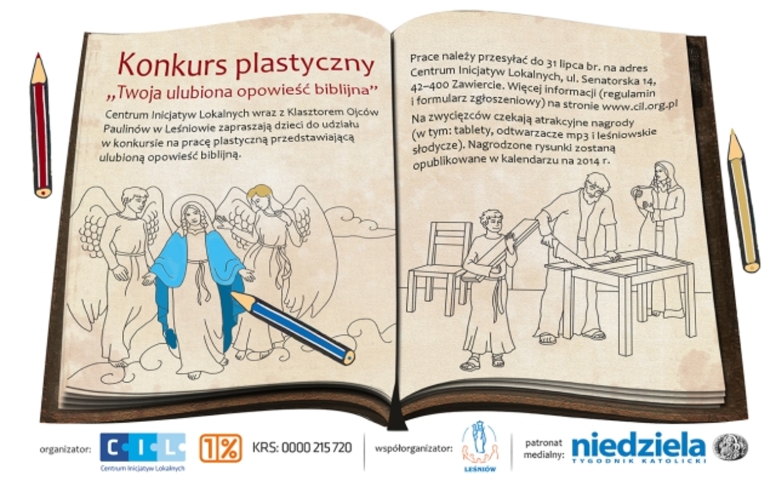 Centrum Inicjatyw Lokalnych, Klasztor Ojców Paulinów w Leśniowie oraz Tygodnik Katolicki „Niedziela” zapraszają do udziału w ogólnopolskim konkursie plastycznym pn. „Twoja ulubiona opowieść biblijna”. Konkurs skierowany jest do dzieci w wieku 4-13 lat z całej Polski.