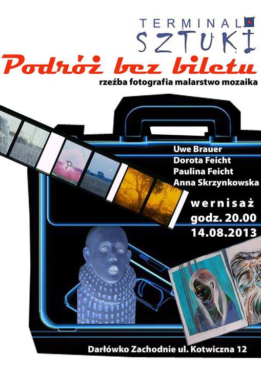 14 sierpnia o godz. 20:00 - zapraszamy do Terminala Sztuki na kolejny (tego lata) wernisaż. Tym razem prezentowana będzie rzeźba, fotografia, malarstwo i mozaika. Prace: Anny Skrzynkowskiej, Uwe Brauer oraz Doroty i Pauliny Feicht -prezentowane będą na wspólnej wystawie pn.: „Podróż bez biletu". Polecamy uwadze.