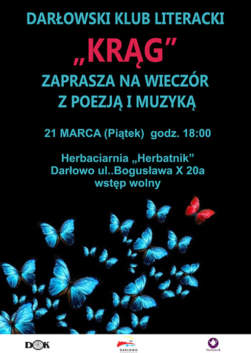 Darłowski Klub Literacki KRĄG ma przyjemność zaprosić na kolejne spotkanie z poezją i muzyką, które odbędzie się już w najbliższy piątek tj. 21 marca 2014 roku w Darłowie, przy ul. Bogusława X 20 - Herbaciarnia Herbatnik. Wstęp Wolny. Polecamy uwadze.