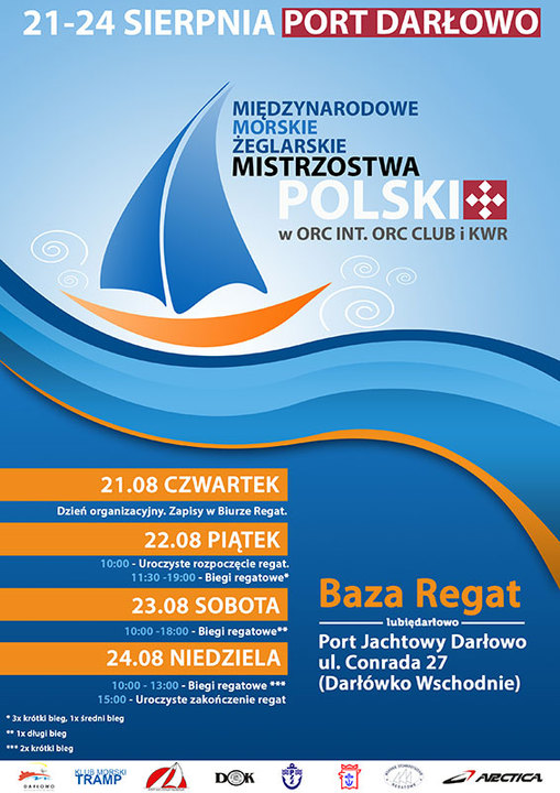 KŻM PZŻ, Klub Morski Tramp oraz Miasto Darłowo pragną zaprosić wszystkich pasjonatów żeglarstwa do udziału i rywalizacji o tytuł Mistrza Polski w zaplanowanych na 21-24 sierpnia Międzynarodowych Morskich Żeglarskich Mistrzostwach Polski w ORC INT., ORC Club i KWR. Biegi regatowe w dniach 22, 23 i 24 sierpnia zostaną rozegrane na wodach Morza Bałtyckiego w okolicach portu Darłowo, sam port natomiast będzie portem bazowym wspomnianych mistrzostw. Uroczyste rozpoczęcie regat zaplanowano na godzinę 10:00, 22 sierpnia, które odbędzie się w darłowskiej marinie tj. Port Jachtowy Darłowo (Darłówko Wschodnie - ul. Conrada 27). Wszystkich zainteresowanych, oraz wypoczywających w Darłowie i okolicach turystów zapraszamy do kibicowania załogom. Miejscem idealnym do obserwowania zmagań regatowych będą zarówno falochrony wschodni jak i zachodni a także plaża wschodnia i zachodnia Darłówka. W niedzielę 24 sierpnia poznamy żeglarskiego Mistrza Polski a uroczyste zakończenie regat połączone z dekoracją zwycięzców rozpocznie się o godzinie 15:00 (PORT JACHTOWY DARŁOWO).