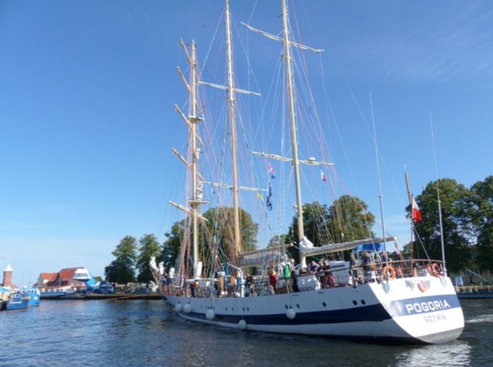 W Darłowie żaglowiec będzie udostępniony dla zwiedzających w godzinach od 12 do 16. STS Pogoria - stalowa, trójmasztowa barkentyna zbudowana w 1980 r. w Stoczni Gdańskiej im. W. Lenina. Ma wymiary: dł. całkowita 46,8m, szerokośc 8 m, wys. 33,5 m, powierzchnia ozaglowania 909 m kw., załoga 7+46 osób. Pogoria jest malowana na biało z szerokim niebieskim pasem. Barkentyna jest pierwszym dużym żaglowcem zaprojektowanym przez polskiego konstruktora statków - inż. Zygmunta Chorenia i stanowiła pierwowzór dla kilku podobnych jednostek, w budowie których polskie stocznie później się wyspecjalizowały. Były to: Pogoria, Iskra i bułgarska Kaliakra, a nieco później Oceania. Pogoria powstała na zamówienie Telewizji Polskiej dla Bractwa Żelaznej Szekli. Bractwo powstało z inicjatywy kpt. Adama Jassera w 1971 r. i dorobiło się z czasem własnej audycji w TV pod nazwą Latający Holender prowadzonej przez kpt. Krzysztofa Baranowskiego, pierwszym kapitanem "Pogorii" został były kpt. "Iskry" kmdr por. Piotr Bigaj, który następnie oddał dowództwo Krzysztofowi Baranowskiemu. Znaki przypominające krzyże, które przez wiele lat nosiła Pogoria na żaglach rejowych, to cztery skrzyżowane szekle, symbol Bractwa. Debiut Pogorii w regatach Cutty Sark miał miejsce na trasie wyścigu Mon-Karlskrona. Żaglowiec pierwszy minął linię mety, pozostawiając inne jednostki klasy A daleko z tyłu. Zwycięstwo to było bardzo cenne, gdyż "Pogoria" od momentu powstania wzbudzała wiele emocji. Żaglowiec „Pogoria wypłynie z Darłowa w dalszy rejs około godz. 20.