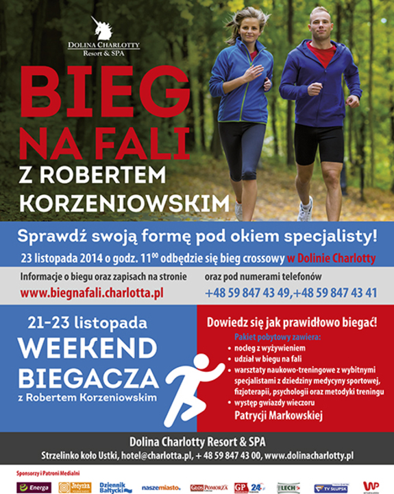 BIEG NA FALI i warsztaty naukowo - treningowe w Dolinie Charlotty to formuła połączonej crossowej imprezy biegowej z płaszczyczyzną szkoleniową służącą optymalnemu poznaniu własnego organizmu i czerpaniu maksimum przyjemności z uprawiania sportu. Liczymy na to, że 12 kilometrowy BIEG NA FALI będzie świetną okazją do sprawdzenia formy tuż przed nadejściem zimy. Podjęcie nowych postanowień i wyznaczenie celów na kolejne miesiące treningów z perspektywą przywitania wiosny w jak najlepszym zdrowiu. Wierzymy, że obok samej rywalizacji sportowej i sprawdzianu fizycznego uczestnicy docenią piękne położenie Doliny Charlotty sprzyjające uprawianiu sportu na naturalnym leśnym podłożu. Naszym celem jest też zbliżanie ludzi, a jednym z elementów ich łączących jest muzyka. Na nasze pierwsze więc spotkanie biegaczy przygotowaliśmy koncert naszej rodzimej wokalistki Patrycji Markowskiej. Jej repertuar sprzyja nie tylko łączeniu pokoleń, ale i różnych nurtów muzycznych.