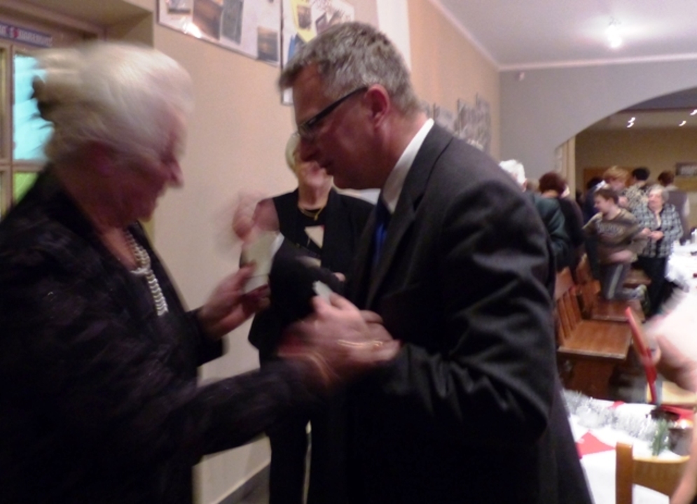 Swoją obecnością uroczystość zaszczycili: burmistrz Darłowa Arkadiusz Klimowicz, wójt gminy Darłowo Radosław Głażewski, przewodnicząca Rady Miejskiej Krystyna Sokolińska, proboszcz Parafii MB. Częstochowskiej Stanisław Piankowski, dyrektorzy placówek oświatowych i kulturalnych, szefowie organizacji pozarządowych zaprzyjaźnieni z pionierami oraz liczni członkowie Klubu Pionierów Ziemi Darłowskiej. Spotkanie opłatkowe zainaugurował występ zespołu muzycznego licealistów pod kierunkiem siostry Emanueli, który grał i śpiewał pastorałki. Na wstępie spotkania minutą ciszy uczczono zmarłych w minionym roku pionierów. Dalej wszystkich serdecznie powitała na opłatku prezes Klubu Pionierów Bożena Tomalak. Przy choince, kawie, herbacie, ciastach i owocach śpiewano kolędy, dzielono się opłatkiem i rozmawiano, co przyniesie nam Nowy Rok 2015. Burmistrz Darłowa, proboszcz kościoła Mariackiego i przewodnicząca Rady Miejskiej złożyli przybyłym życzenia zdrowia, radości, pomyślnego nowego roku i nadziei na lepsze jutro.