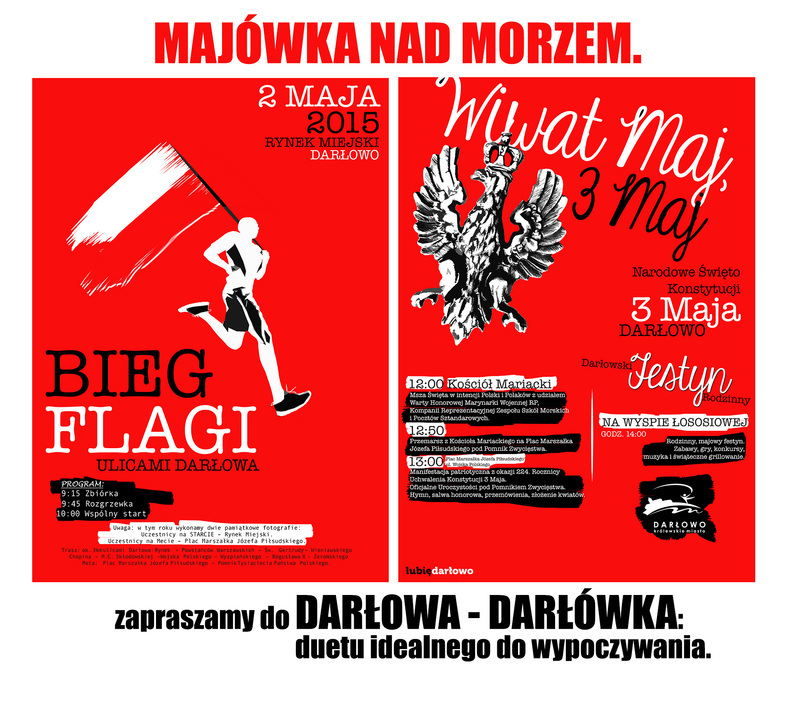 Polecamy spacery. Zwłaszcza te brzegiem morza - po naszych pięknych, szerokich plażach. Wycieczkę turystyczną po mieście, w którym urodził się Król Eryk Pomorski. Podczas majówki - czynne będzie tutejsze Muzeum Zamek Książąt Pomorskich (w godzinach 10:00 - 16:00). Szczególnie polecamy - fitness na świeżym powietrzu - tym razem w patriotycznym tonie. 2 maja bowiem obchodzimy Święto Flagi Rzeczypospolitej Polskiej i z tej okazji odbędzie się darłowski Bieg Flagi. Startujemy o godzinie 10:00 z rynku Miejskiego w Darłowie. Zapraszamy całymi rodzinami. Mile widziane stroje biało-czerwone. https://www.darlowo.pl/pl/?page=imprezy&impreza=1461 Natomiast 3 maja - świętować będziemy 224. Rocznicę uchwalenia Konstytucji 3 maja. Uroczystości rozpoczną się o godzinie 12:00. Szczegółowy program został opublikowany pod adresem: https://www.darlowo.pl/pl/?page=imprezy&impreza=1462