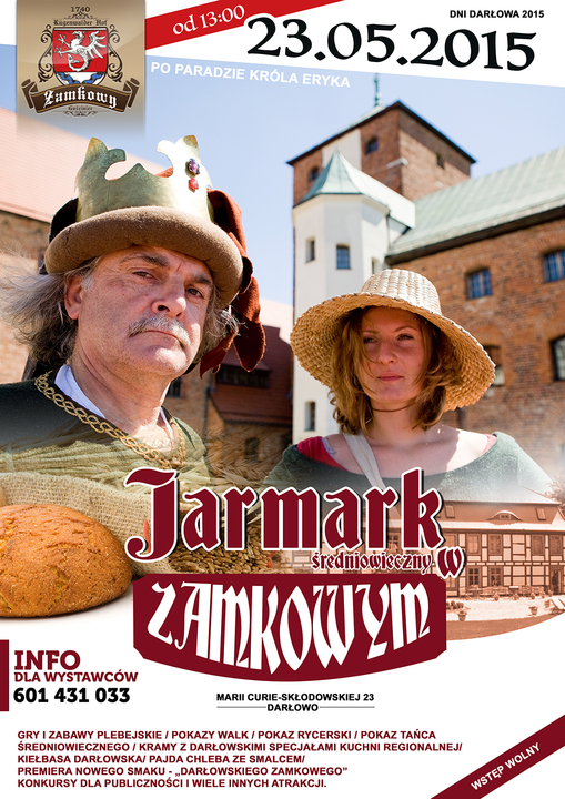 Pokazy walk, pokaz rycerski, pokaz tańca średniowiecznego, zabawy plebejskie, konkurs historyczny, konkurs wiedzy o Darłowie, jarmark średniowieczny, kramy z darłowskimi specjałami kuchni regionalnej. Ponadto darłowska kiełbasa, pajda chleba ze smalcem i premiera nowego smaku „Darłowskiego Zamkowego". To wszystko będzie można zobaczyć i przeżyć już 23 maja, w sobotę, w Zamkowym. Początek Jarmarku, godz. 13:00. Tuż po Paradzie Króla Eryka, w ramach Dni Darłowa 2015. Wystawców zapraszamy do współpracy, gości do wspólnej zabawy.