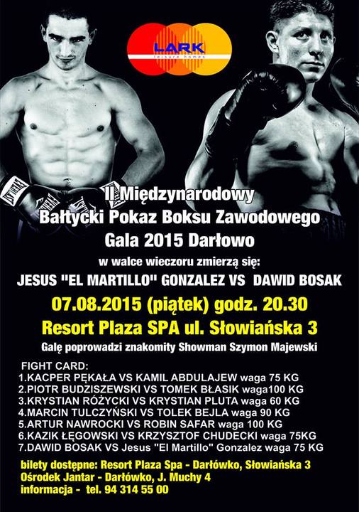 7 sierpnia (piątek) w Darłówku Wschodnim odbędzie się Gala Boksu Zawodowego. Zmagania bokserów zobaczymy w RESORT PLAZA SPA, przy ul. Słowiańskiej 3. W walce wieczoru zmierzą się JESUS "EL MARTILLO" GONZALES i DAWID BOSAK. Galę poprowadzi Szymon Majewski.