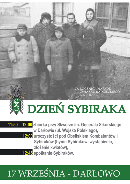Związek Sybiraków - koło w Darłowie oraz Miasto Darłowo zapraszają do udziału w oficjalnych obchodach 76. rocznicy napadu Związku Radzieckiego na Polskę.