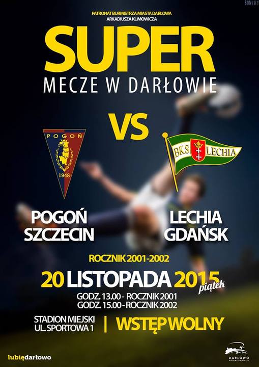 Już jutro zapraszamy wszystkich fanów piłki nożnej na dwa super mecze. Na stadionie miejskim w Darłowie rozegrane zostaną dwa spotkania pomiędzy klubami Lechia Gdańsk, a Pogonią Szczecin. O godz. 13.00 rozpoczenie się pierwsze widowsiko, które zapewni nam piłkarski rocznik 2001, a o godz. 15.00 rocznik 2002. Wstęp wolny. Zapraszamy