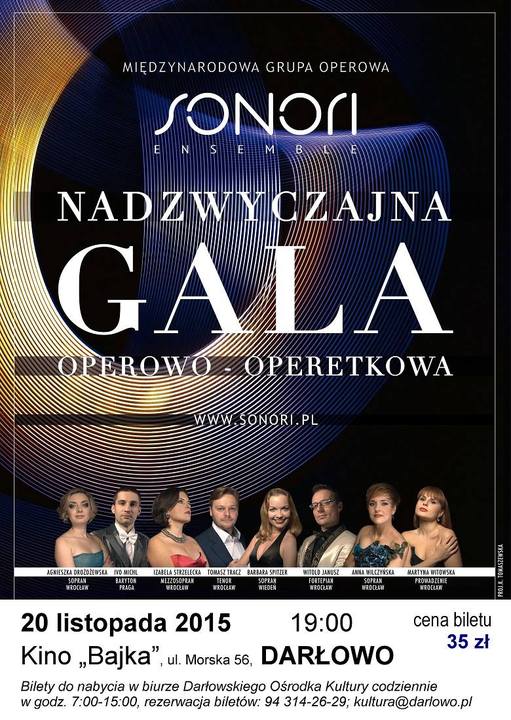 Wyjątkowa gala operowo – operetkowa, w wykonaniu znakomitych głosów europejskich znanej i lubianej Międzynarodowej Grupy Operowej Sonori Ensemble będzie miała miejsce już jutro (20 listopada), o godz. 19 w Darłowskim kinie "Bajka"). Czardasze, walce, toasty, miłosne arie i duety, sceny operowe i operetkowe, a także standardy jazzowe oprawione barwnym komentarzem to niepowtarzalna podróż muzyczna, pełna emocji i wzruszeń. W trakcie spektaklu zabrzmią najsłynniejsze sceny z oper: „Traviata“, „Lakme“, „Carmen“, „Opowieści Hoffmanna“, „Nabucco”, „Czarodziejski flet”, „Halka”, Rigoletto”, „Don Giovanni”, „Porgy and Bess“ i wiele innych. Powróci czar dawnego Wiednia ukryty w najpiękniejszych scenach operetkowych. Nadzwyczajny koncert galowy w towarzystwie śpiewaków z Wiednia, Pragi i Wrocławia to niezapomniany wieczór!
