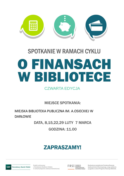 Miejska Biblioteka Publiczna zaprasza do udziału w czwartej edycji spotkań w ramach cyklu pn.: „O finansach w bibliotece". Spotkania zaplanowano na: 8,15,22,29 lutego oraz 7 marca. Wszystkie odbędą się w Darłowie w siedzibie Miejskiej Biblioteki Publicznej im. Agnieszki Osieckiej przy ul. Wieniawskiego 19C. Polecamy uwadze i zapraszamy.