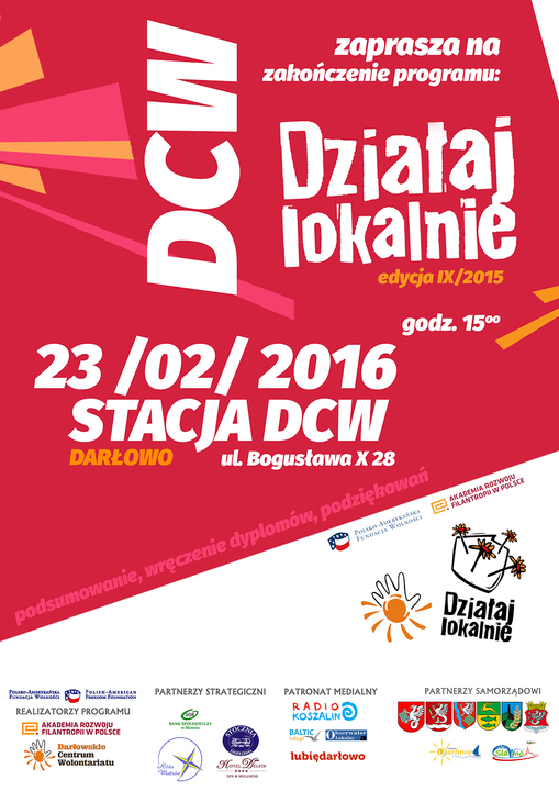 Darłowskie Centrum Wolontariatu - Certyfikowany Ośrodek Działaj Lokalnie zaprasza we wtorek, 23 lutego 2016 roku o godzinie 15:00 do swojej siedziby na Stacji DCW (ul. Bogusława X 28), gdzie o godzinie 15:00 rozpocznie się oficjalne podsumowanie zrealizowanych w roku 2015 projektów w ramach dziewiątej edycji Działaj Lokalnie. Zapraszamy.