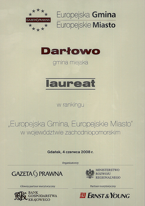 Darłowo zostało laureatem w ogólnopolskim rankingu „ Europejska Gmina, Europejskie Miasto”. Burmistrz Darłowa Arkadiusz Klimowicz odebrał dla miasta wyróżnienie w trakcie uroczystej gali zorganizowanej 4 czerwca w Gdańsku. Ranking opracował ogólnopolski wysokonakładowy dziennik „Gazeta Prawna” wraz z Ministerstwem Rozwoju Regionalnego. Partnerem konkursu był Bank Gospodarstwa Krajowego i firma konsultingowa Ernst&Young.UM