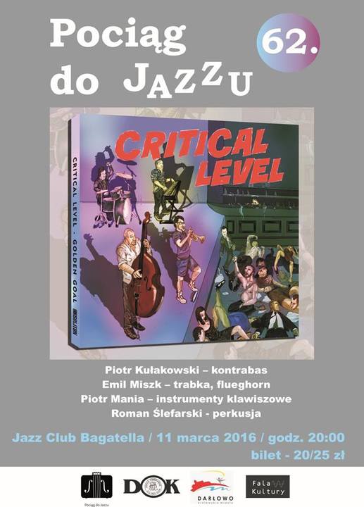 Fala Kultury i Darłowski Ośrodek Kultury zapraszają na koncert: Critical Level czyli Piotr Kułakowski (kontrabas), Emil Miszk (trąbka, flueghorn), Piotr Mania (instrumenty Klawiszowe), Roman Ślefarski (perkusja). Koncert odbędzie się w ramach imprezy cyklicznej – 62. Pociągu do Jazzu. Początek – godz. 20:00. Impreza biletowana – 20/25 zł. Zapraszamy.