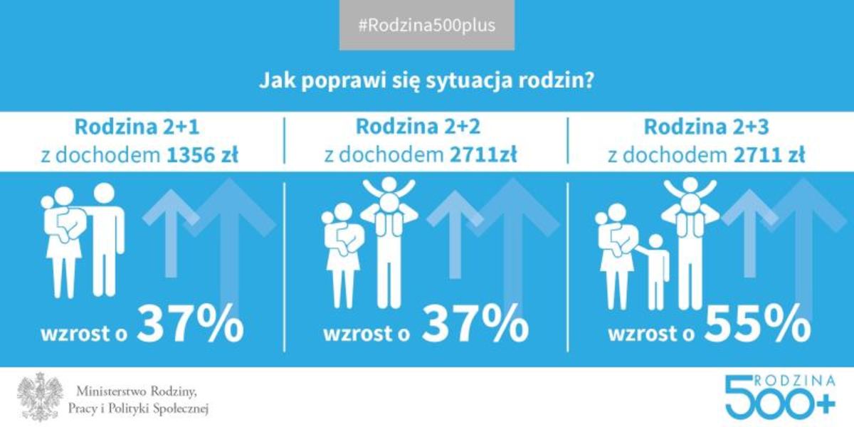 Ustawa z dnia 11 lutego 2016 r o pomocy państwa w wychowywaniu dzieci ( Dz.U. z 2016 r, poz. 195) wprowadziła nowe tzw. świadczenie wychowawcze w wysokości 500 zł miesięcznie na każde drugie i kolejne dziecko bez dodatkowych warunków. Rodziny , których dochód na osobę nie przekroczy 800 zł lub 1.200 zł w przypadku wychowywania dziecka niepełnosprawnego otrzymają 500 zł również na pierwsze dziecko.