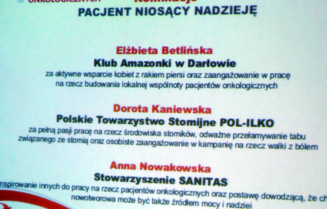 Zostałam wyróżniona w kategorii PACJENT NIOSĄCY NADZIEJĘ 2015.Nominację zgłosił Gminny Ośrodek Pomocy Społecznej w Darłowie, wyróżnienie jest również wyróżnieniem dla moich koleżanek z Klubu Amazonki w Darłowie.Nagroda doda mi jaskółczych skrzydeł, w życiu człowiek jest najważniejszy, nadal będziemy pomagać, małe uczynki, ale czynione z sercem.
