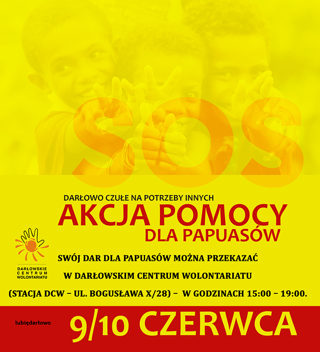 Przypominamy, że dziś i jutro (9/10.06.2016) w Darłowskim Centrum Wolontariatu można przekazać rzeczy z przeznaczeniem na wsparcie prowadzonej w miejsce akcji pomocy dla mieszkańców Papui Nowej Gwinei.