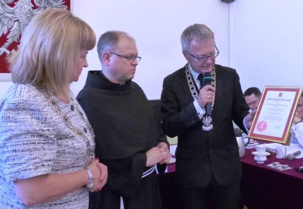 Dwanaście lat kadencji Księdza Proboszcza Stanisława Piankowskiego i Gwardiana Klasztoru Franciszkanów w Darłowie minęło bardzo szybko. Niestety, nadszedł ten czas pożegnania się z ustępującym Proboszczem i złożenia najserdeczniejszego DZIĘKUJĘ za trud i wysiłek pracy, jaki Ojciec Stanisław włożył w naszą parafię i miasto Darłowo. Z tej okazji burmistrz miasta Darłowa Arkadiusz Klimowicz na sesji Rady Miejskiej w imieniu własnym i samorządu powiedział kilka zdań na pożegnanie. Dziękujemy Bogu, że losy wybitnego kapłana zbiegły się z losami Darłowa. Rozstajemy się, lecz nie żegnamy i mamy nadzieję, na dalsze serdeczne spotkania. Trudno jest opisać zasługi, jakie położyłeś dla parafii i miasta Darłowa. Spróbuję jednak wymienić kilka istotnych działań. Pamiętamy o uratowaniu misternie rzeźbionej zabytkowej ambony z 1684 r. i ołtarza przed szkodnikami poprzez gazowanie Kościoła Mariackiego. Cieszymy się z renowacji niezwykle cennego obiektu darłowskiego bazylikowego kościoła, jakim jest późnobarokowy prospekt organowy, najwyższej klasy obiekt zabytkowy na Pomorzu. Dumni jesteśmy z naprawy i konserwacji organów darłowskiej fary, które w opinii fachowców ustępują jedynie organom z Kamienia Pomorskiego. Gratulujemy proboszczowi pozyskania blisko 1,3 mln zł unijnego wsparcia na remont ścian, dachu i wnętrza wieży naszej świątyni oraz przeprowadzenia tego remontu. Nasze myśli przywoływać będą obrazy z uroczystości kościelnych, pielgrzymek, dni seniora, kombatanta, dni białej laski, opłatków z niepełnosprawnymi i Amazonkami, procesji pokutnej i procesji czterech króli, świąt narodowych, rocznicy 3-Maja, rocznic Odzyskania Niepodległości, Dnia Osadnika i wiele innych. Były to wydarzenia, które nas jeszcze bardziej łączyły i uczyły. Dziękujemy Ci wszyscy za wszystko, co dla nas zrobiłeś, za to, że będąc sobą, dawałeś nam świadectwo prawdziwej wiary i pobożności. O. Stanisław Piankowski OFMConv został nowym Proboszczem Parafii Podwyższenia Krzyża Świętego i Gwardianem klasztoru w Koszalinie. Wyrażając naszą radość z wyboru życzymy Ci, drogi Ojcze Stanisławie dużo zdrowia i siły. Bądź świadomy, że zawsze będziemy Cię dobrze wspominać i zostawiamy dla Ciebie otwarte drzwi naszych serc. Szczęść Boże! Na pamiątkę doskonałej współpracy z darłowskim samorządem burmistrz wręczył specjalne podziękowanie i darłowska specjalność najwyższej klasy, jakim jest żaglowiec z rybich ości.