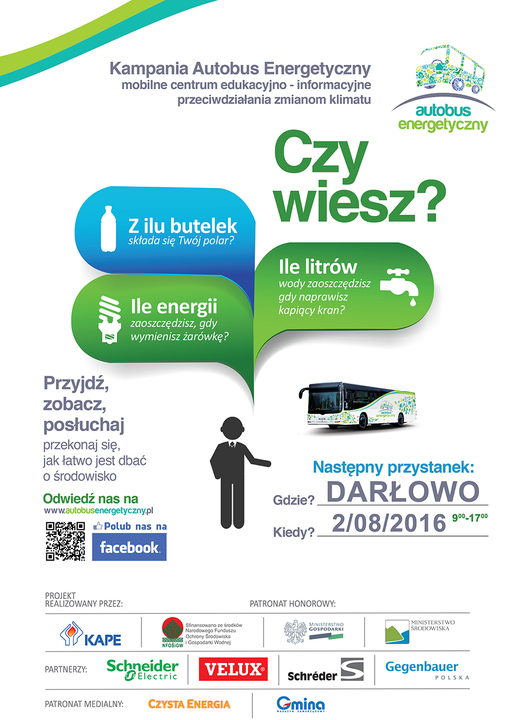 2 sierpnia br. do Darłowa zajedzie Energetyczny Autobus z kampanią edukacyjno - informacyjną mającą na celu przekonanie odbiorców do tego, że warto jest dbać o środowisko i nie jest to trudne. Mamy wpływ na zmiany zachodzące w klimacie - wpływ również mamy na to, by temu przeciwdziałać.