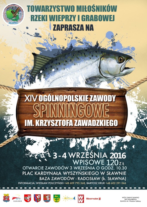 Towarzystwo Miłośników Rzeki Wieprzy i Grabowej zaprasza na dwudniowe 14. Ogólnopolskie Zawody Spinningowe im. Krzysztofa Zawadzkiego. Bazą zawodów będzie miejscowość Radosław koło Sławna. Zawody zostaną przeprowadzone w dniach 3 i 4 września 2016 Patronat nad zawodami objęly miasta i gminy powiatu sławieńskiego. O dalsze szczegóły proszę telefonować pod numery: 609 795 568 i 6002291 066.