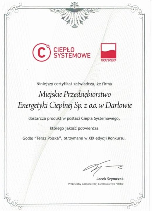 Ta miejska Spółka z o.o. mająca swą siedzibę w Darłowie przy ul S. Żeromskiego 15 działa na darłowskim rynku ciepłowniczym od roku 1994. Kosztem blisko 8 milionów złotych 3 listopada 2000 roku oddano do użytku nowy miejski system ciepłowniczy. Stare węglowe ogrzewanie zastąpiono gazowo-olejowym. Od tego czasu istniejących 6 osiedlowych kotłowni była wielokrotnie modernizowana W czerwcu br. MPEC dołączył do grona dostawców ciepła systemowego. Oznacza to, że wytwarzane i dostarczane odbiorcom ciepło spełnia najwyższe standardy w branży. Od lica 2017 darłowski MPEC może i posługuje się Godłem Teraz Polska, którym nagrodzone zostały wszystkie firmy dostarczające ciepło systemowe. Aby móc korzystać z tego prestiżowego wyróżnienia musiano spełnić szereg określonych warunków i wymagań w zakresie obsługi klienta oraz norm związanych z produkcją i przesyłem ciepła. Każda z kotłowni wyposażona jest w Aktywny System Bezpieczeństwa Instalacji Gazowej, który zapewnienia bezpieczeństwo eksploatacji urządzeń gazowych i reaguje automatycznie natychmiast w przypadkach wycieku gazu z instalacji. Obecnie dołączyliśmy do najlepszych firm ciepłowniczych w kraju mówi Marian Moroz kierownik działu eksploatacji. Weryfikacją standardów jakości obsługi i technologii zajmuje się Izba Gospodarcza Ciepłownictwo Polskie, która wysoko oceniła darłowska spółkę. Obecnie MPEC zachęca swoich odbiorców ciepła, tych którzy mają jeszcze łazienkowe piecyki gazowe do ogrzewania wody do przejścia na centralny system ogrzewania i dostarczania ciepłej wody do mieszkań. Takie rozwiązania stosowane są powszechnie w nowszym wielorodzinnym budownictwie. Jest ono znacznie bezpieczniejsze i oszczędniejsze. Gratulujemy wyróżnienia!