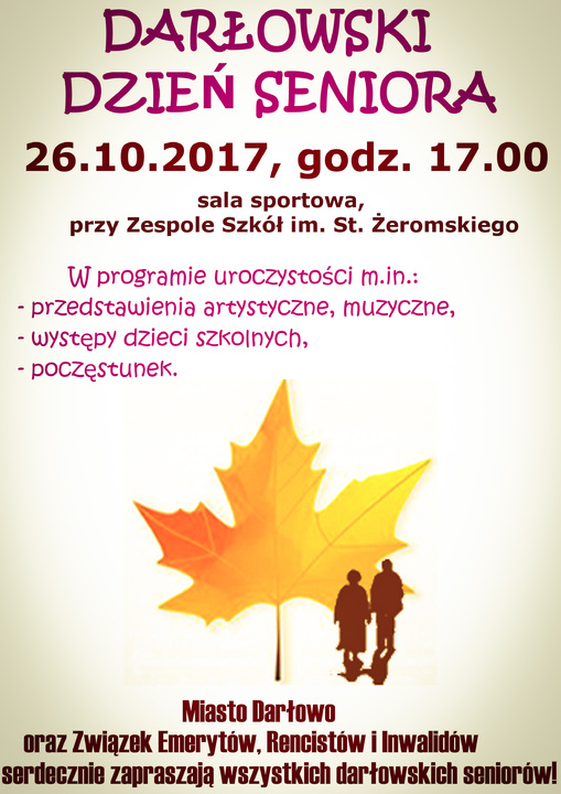 Miasto Darłowo oraz Związek Emerytów, Rencistów i Inwalidów w Darłowie serdecznie zapraszają wszystkich darłowskich seniorów na uroczyste obchody Miejskiego Dnia Seniora, które odbędą się 26 października 2017 r. w sali sportowej Zespołu Szkół im. St. Żeromskiego o godz. 17.00.