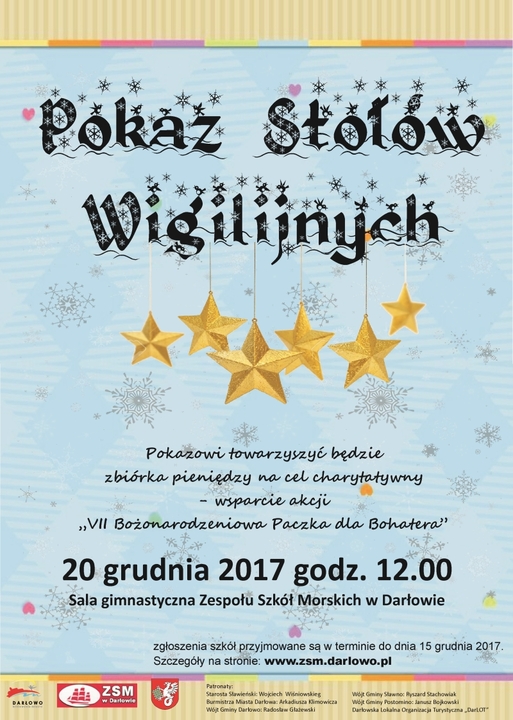 Zespół Szkół Morskich w Darłowie zaprasza na coroczny Pokaz Stołów Wigilijnych, który w tym roku zaplanowano na 20 grudnia - tj. środę. Rozpoczęcie nastąpi tradycyjnie o godz. 12:00 w sali gimnastycznej szkoły - w Darłowie przy ul. Szpitalnej 1. Podczas uroczystego pokazu prowadzona będzie zbiórka na cel charytatywny - akcję "VII Bożonarodzeniowa Paczka dla Bohatera" .