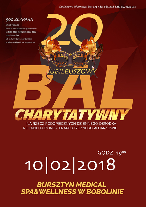 Już po raz dwudziesty Stowarzyszenie Osób Niepełnosprawnych, ich Rodzin i Przyjaciół na Terenie Ziemi Darłowskiej i Gmin Ościennych ma przyjemność zaprosić na 20 Jubileuszowy Bal Charytatywny.