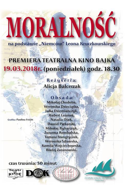 Teatr w Kinie zaprasza na kolejny spektakl w wydaniu aktorów z Darłowa. Tym razem dramat Leona Kruczkowskiego z 1949 roku „Niemcy". „Moralność" w reżyserii Alicji Balecrzak to sztuka w pięciu aktach bez atraktu. Czas trwania 50 min. Premiera: 19 marca br. (poniedziałek). Godzina? 18:30. Wstęp wolny.