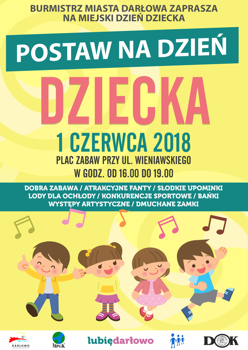 Burmistrz Miasta Darłowa zaprasza wszystkie dzieci w dniu ich święta - 1 czerwca 2018 na miejski plac zabaw przy ul. Wieniawskiego, gdzie w godzinach 16:00 - 19:00 odbędzie się impreza "Postaw na Dzień Dziecka". Gwarantujemy dobrą zabawę, atrakcyjne fanty, słodkości, lody dla ochłody, konkurencje sportowe, występy artystyczne, mydlane bańki, dmuchane zamki i wiele innych atrakcji ! Zapraszamy !!!