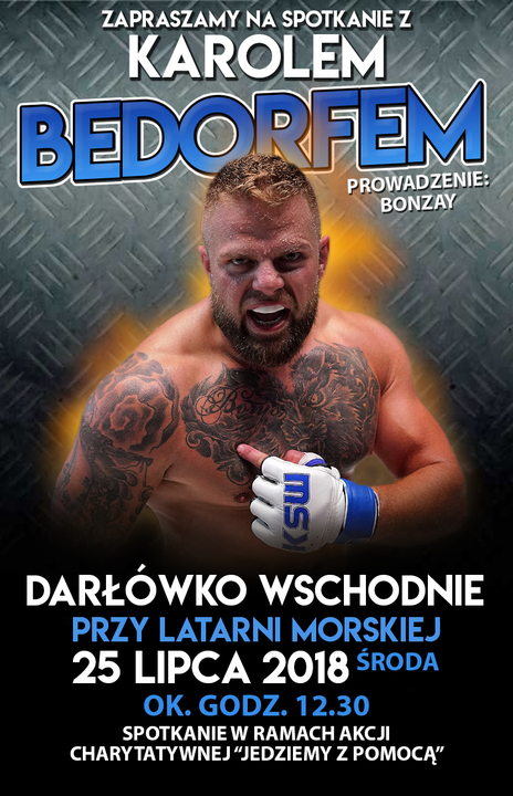 Już w najbliższą środę 25 lipca razem z niezwykłą akcją charytatywną do Darłowa zawita wybitny zawodnik mieszanych sztuk walki - Karol Bedorf. Nie tak dawno mogliśmy oglądać jego zwycięstwo z Mariuszem Pudzianowskim na gali KSW. Dzisiaj Karol walczy o zdrowie dzieci, które zostały poszkodowane w wypadkach drogowych. Sportowiec już 3 raz organizuje niezwykły rajd rowerowy podczas, którego razem z przyjaciółmi pozyskują środki finansowe na ten szczytny cel. Tym razem na "dwóch kółkach" grupa wystartowała ze Szczecina. Meta zaplanowana jest w Sopocie. Na trasie również przewidziany jest checkpoint w Królewskim Mieście. Karola będziemy mogli spotkać ok. godz. 12.30 w Darłówku Wschodnim przy Latarni Morskiej. Zawodnik federacji KSW ma ze sobą plakaty, okolicznościowe naklejki oraz koszulki, które będziecie mogli nabyć razem z autografami. Spotkanie poprowadzi Bonzay. "Akcję można wesprzeć podczas naszych postojów lub przelewając pieniądze na konto naszej akcji: 60116022020000000137913839 Bank Millennium, w tytule przelewu - Jedziemy z Pomocą." Polecamy uwadze.