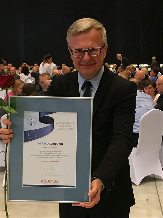 Na XVI Samorządowym Forum Kapitału i Finansów w Katowicach, jakie odbyło się w dniach 3 i 4 października 2018 Arkadiusz Klimowicz burmistrz miasta Darłowa odebrał dyplom i gratulacje za zdobycie V miejsca w rankingu Pisma Samorządu Terytorialnego WSPÓLNOTA podsumowującym wydatki inwestycyjne finansowane ze środków Unii Europejskiej w latach 2014-2017 w kategorii Małe Miasta.