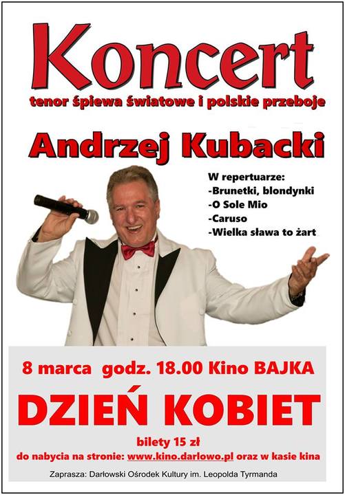 Darłowski Ośrodek Kultury im. L. Tyrmanda w Darłowie zaprasza wszystkie panie wraz z osobami towarzyszącymi do udziału w specjalnym koncercie z okazji Dnia Kobiet. Tenor - Andrzej Kubacki zaśpiewa m.in. takie muzyczne hity jak: Brunetki, blondynki / O Sole Mio / Caruso / Wielka sława to żart.