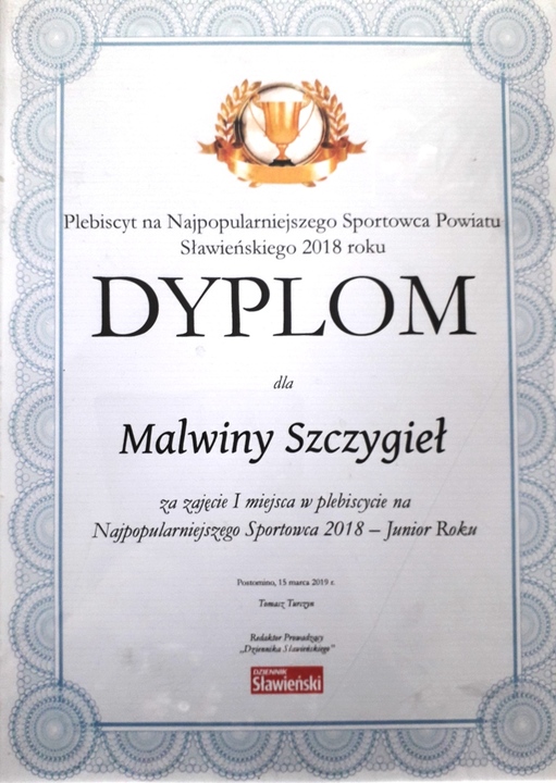W dniu 15 marca 2019 roku Siostry, Malwina i Martyna Szczygieł z Darłowa, biorąc udział w Plebiscycie na Najpopularniejszego Sportowca Powiatu Sławieńskiego 2018 roku, zdobyły I miejsce w kategorii Junior Roku. Finał plebiscytu odbył się w Centrum Kultury i Sportu w Postominie.