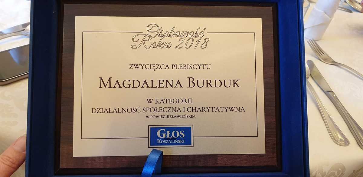 Magdalena Burduk, kierownik Biura Promocji Miasta i Komunikacji Społecznej w darłowskim ratuszu została  w marcu podwójnie wyróżniona za swoją działalność. Pierwszą nagrodę otrzymała jako zwycięzca plebiscytu Głosu Koszalińskiego na osobowość roku 2018 w kategorii działalność społeczna i charytatywna w powiecie sławieńskim.