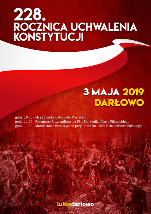 Burmistrz Miasta Darłowa i Przewodniczący Rady Miejskiej serdecznie zapraszają do udziału w uroczystych obchodach 228. Rocznicy Uchwalenia Konstytucji 3. Maja.