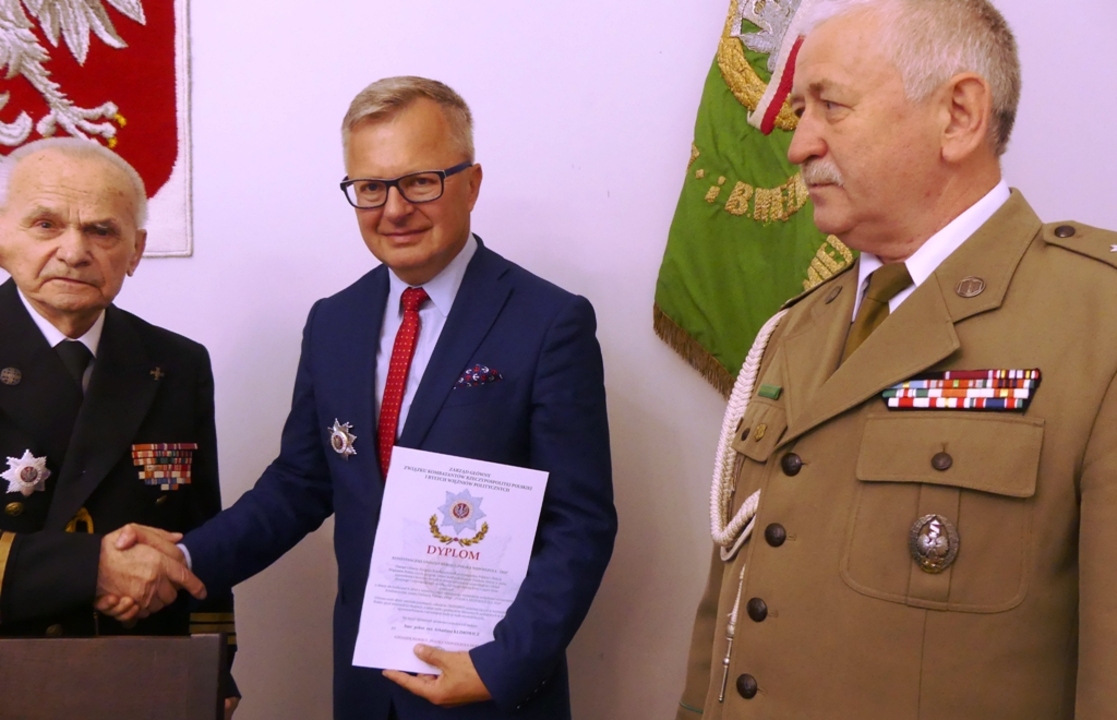 W otoczeniu przedstawicieli rodzin i zarządu koła Kombatanckimi Gwiazdami Pamięci „Polska Niepodległa 1918” uhonorowano: por. Kazimierza Kuligowskiego, por Zygmunta Jeża, por. Albina Lemańczyka, por. Jóizefa Gibułę, starszego sierżanta Stanisława Hołuba i podchorążego rezerwy Arkadiusza Klimowicza. Kombatanckie Gwiazdy Pamięci „Polska Niepodległa 1918” w imieniu zarządu głównego ZKRP I BWP wręczył wiceprezes zarządu miejsko- gminnego podpułkownik Mikołaj Kaczanowicz.  Kombatancka Gwiazda Pamięci została ustanowiona z okazji obchodów 100. rocznicy odzyskania przez Polskę niepodległości. Honoruje ona członków Związku Kombatantów Rzeczypospolitej Polskiej i Byłych Więźniów Politycznych uczestniczących w wyzwoleniu Polski spod niemieckiej okupacji, a także osoby i podmioty zbiorowe zasłużonych w dziele upowszechniania i utrwalania tradycji walk o wolną Polskę. To zaszczytne wyróżnienie otrzymał również burmistrz Darłowa Arkadiusz. Jak podkreślał por. Kazimierz Kuligowski kombatanci zawsze byli wspierani i w dalszym ciągu są pod opieką gospodarza Darłowa i zasypał uczestników spotkania  dokonaniami burmistrza na rzecz kombatantów. Wspomnę jedynie kilka z nich jak np. ufundowanie granitowych tablic  z nazwiskami wszystkich darłowskich kombatantów niezależnie od ich przynależności do organizacji konspiracyjnych, wydanie książki poświęconej miejscowym kombatantom, pokrycie kosztów zakupu okolicznościowych odznaczeń dla kombatantów itd.